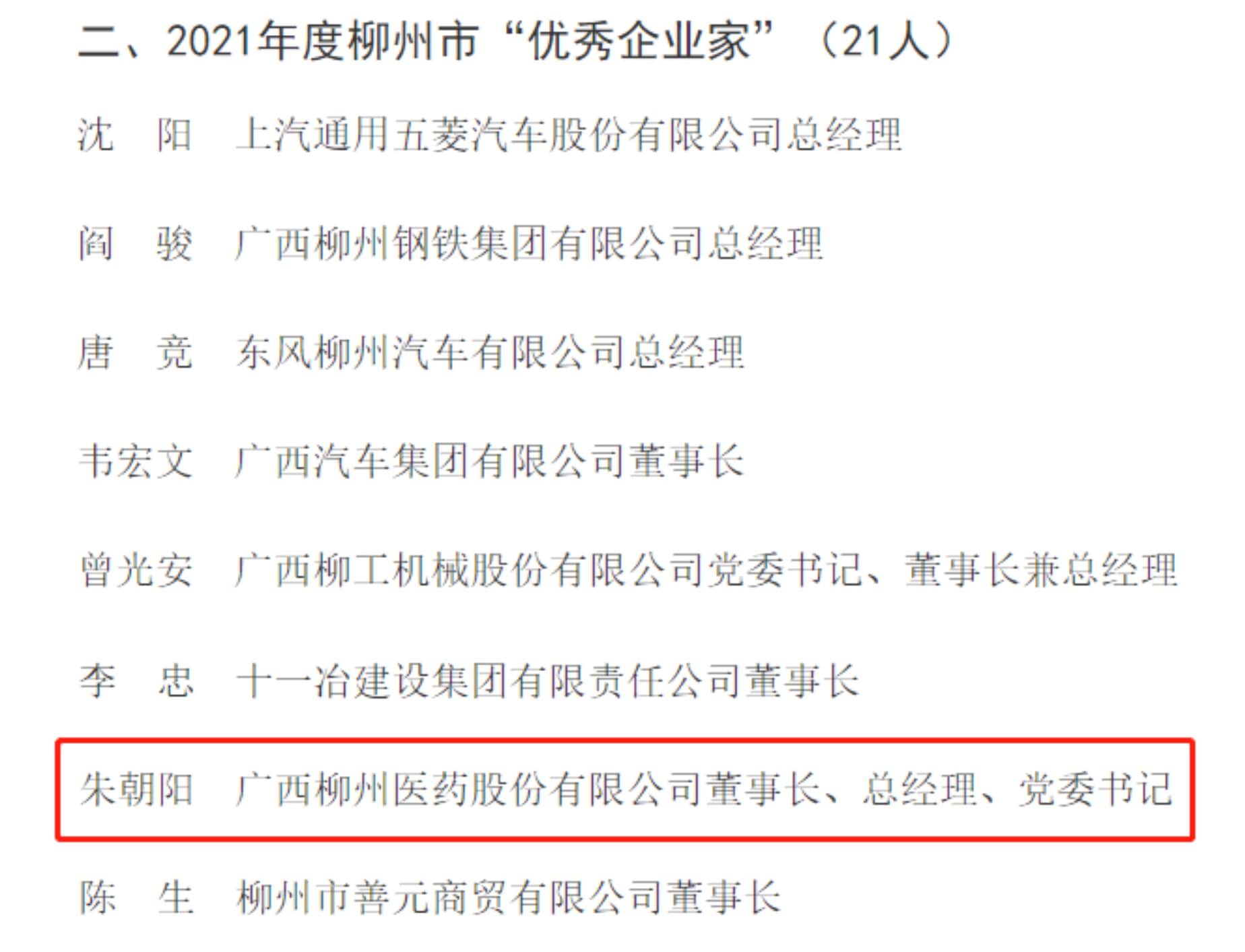 柳药股份董事长、总经理朱朝阳先生获评2021年度柳州市“优秀企业家”;