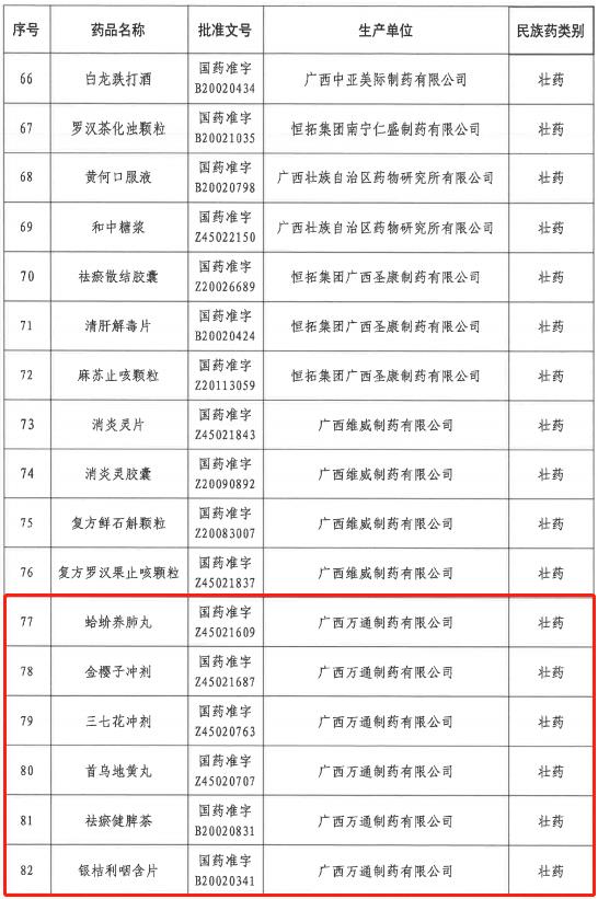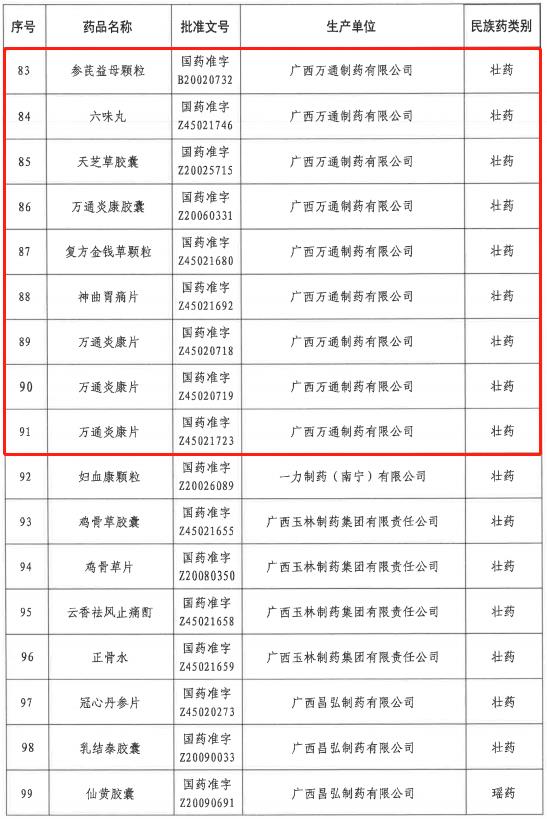 近日,自治区中医药管理局公布第一批经广西民族医药专家委员会认定的广西民族药名单,其中柳药集团旗下万通制药生产的复方金钱草、万通炎康片、天芝草胶囊、祛瘀健脾茶等15个产品,康晟制药生产的安神养血口服液、归芪补血口服液、胃乐胶囊等4个产品,合计19个产品在列。