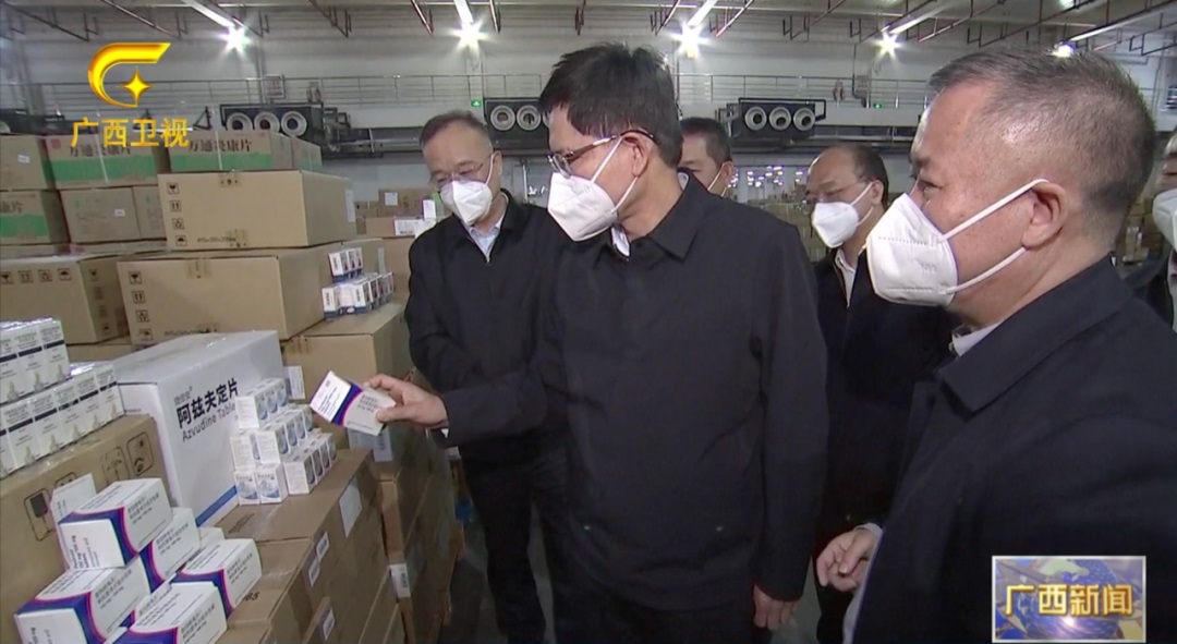 1月7日,自治区主席蓝天立率队莅临集团南宁物流中心,就新阶段疫情防控工作开展调研。蓝天立一行先后走进物流中心、防疫药品储备点和中药煎煮中心,实地察看医药物资生产保供情况,勉励企业履行医药承储单位职责,发挥配送网络优势,想方设法筹措物资,竭尽全力保障供应,为全区疫情防控迎峰转段平稳有序作出应有贡献。他要求,全区各级各有关部门要加大统筹力度,进一步充实各级应急医疗物资储备,建立医疗物资流通市场购销存情况动态监测机制,强化价格和质量监管,强化组织调度和运力储备,紧缺药品精准供应,切实保障群众用药需求。